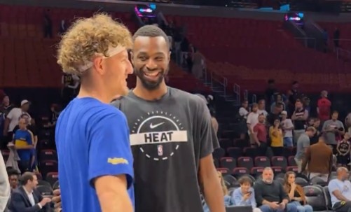 11月20日讯 08:30NBA常规赛,勇士客场挑战热火。赛前,勇士后卫波杰姆斯基找到了热火球员、前队友维金斯,两人笑着寒暄了数句。维金斯2019-20赛季开始,为勇士效