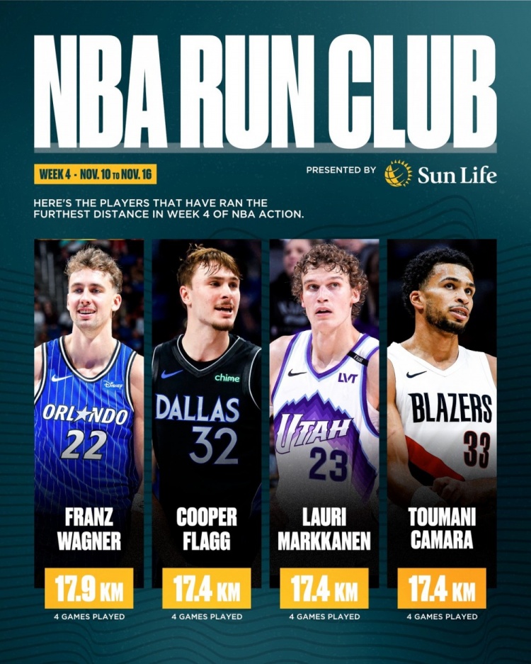 11月17日讯 NBA加拿大官方晒出了本赛季第四周(11月11日-11月17日)跑动距离最长的球员榜,前四位如下(均打了4场比赛):小瓦格纳 17.9公里弗拉格 17.4公里马尔卡宁