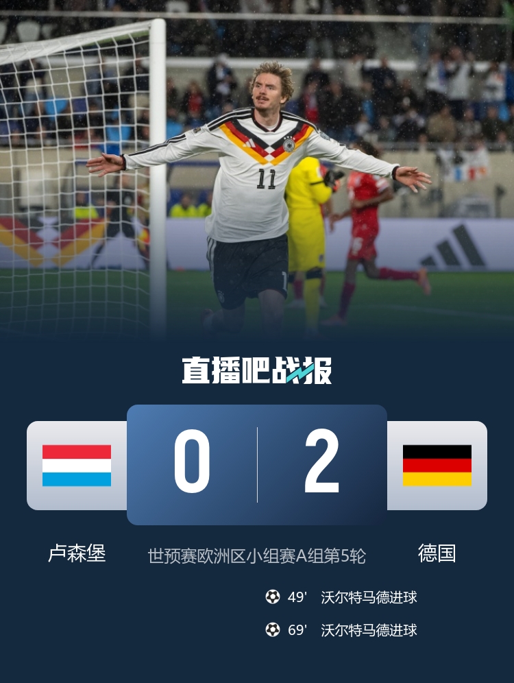 世预赛A组第5轮,德国客场2-0卢森堡,沃尔特马德双响。德国末轮战平斯洛伐克就能头名出线。
