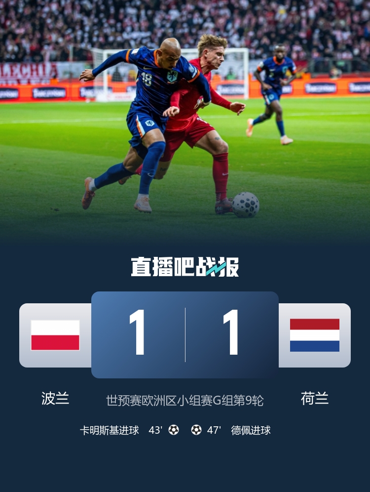 世预赛G组第9轮,荷兰1-1战平波兰,无缘提前出线。但荷兰队目前仍在小组中占据优势。