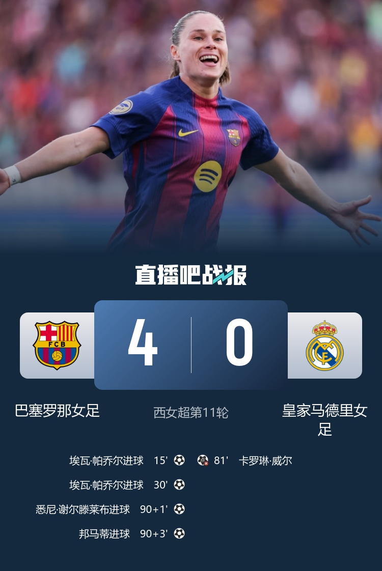 西女超-巴萨女足4-0皇马女足 帕乔尔双响邦马蒂替补建功威尔失点